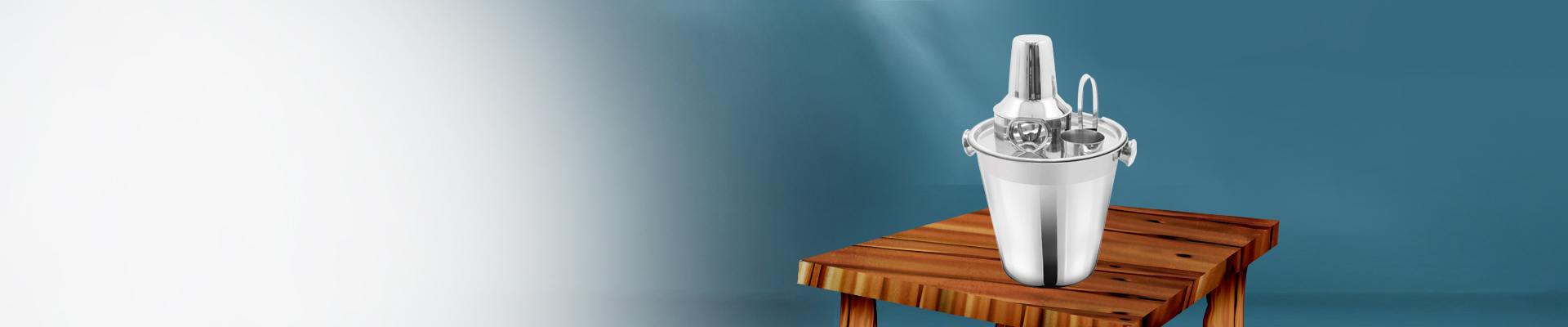 This bar tool set is the complete kit for crafting cocktails, styled clean and contemporary. Gleaming, silvery ice bucket holds the vital bar tools of the mixologist's artbottle opener, jigger ,tong, cocktail shaker for making old fashioneds, mint juleps or trending artisanal cocktails.