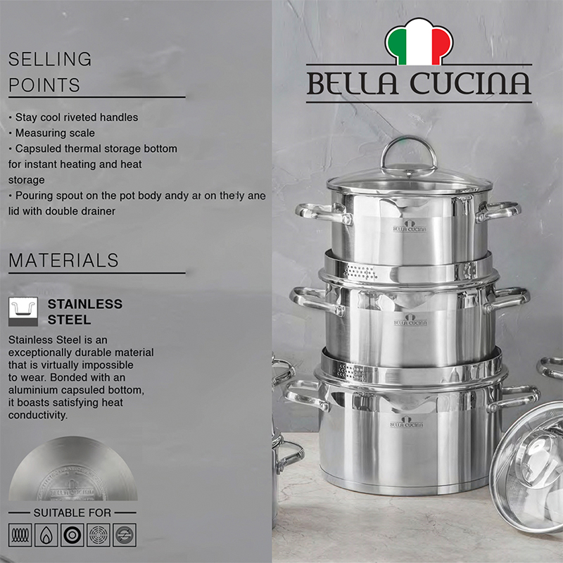 The Bella Cucina Marino Casserole is a high-quality stainless steel cookware designed for optimal performance. Made from 18/10 stainless steel, it provides superior corrosion resistance, making it suitable for kitchenware exposed to moisture. With a durable and non-reactive surface, this casserole ensures that acidic or alkaline foods do not impart unwanted metallic flavors. It is compatible with induction cooking and dishwasher safe, making it versatile and easy to maintain. Its sturdy construction and 0.6mm thick walls offer exceptional durability and strength, ideal for long-lasting kitchen use.