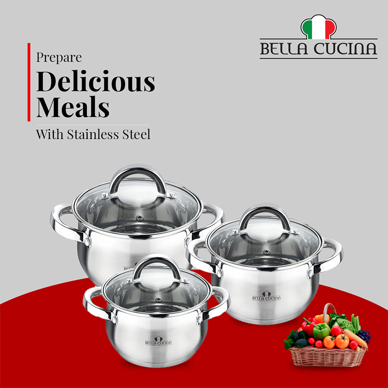 The Bella Cucina 6-Piece Cookware Set is designed to meet all your cooking needs with style and efficiency. Made from premium stainless steel, this induction-compatible set ensures even heat distribution and long-lasting durability. Whether you're boiling, frying, or simmering, this set provides the perfect combination of functionality and elegance for your kitchen.