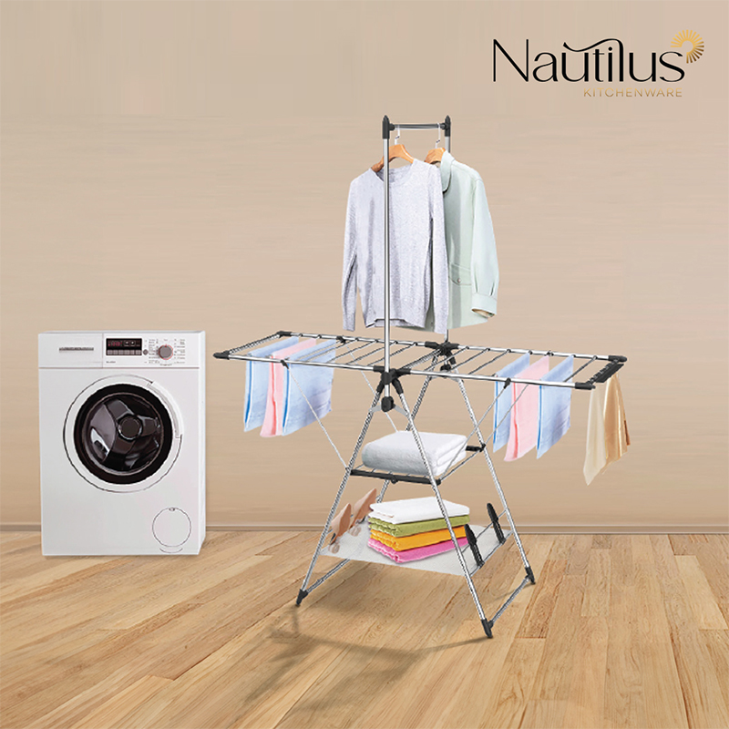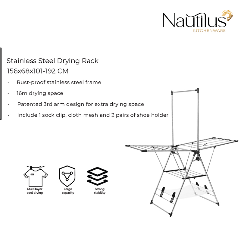 The Nautilus Winged Drying Rack offers a large drying space of 16 meters, supported by a durable steel frame with a powder-coated finish for long-lasting use. It features non-slip legs for enhanced stability, a safety lock mechanism for secure positioning, and a lightweight, foldable design for easy storage. Ideal for both indoor and outdoor use, this drying rack provides a practical and space-efficient solution for drying clothes.