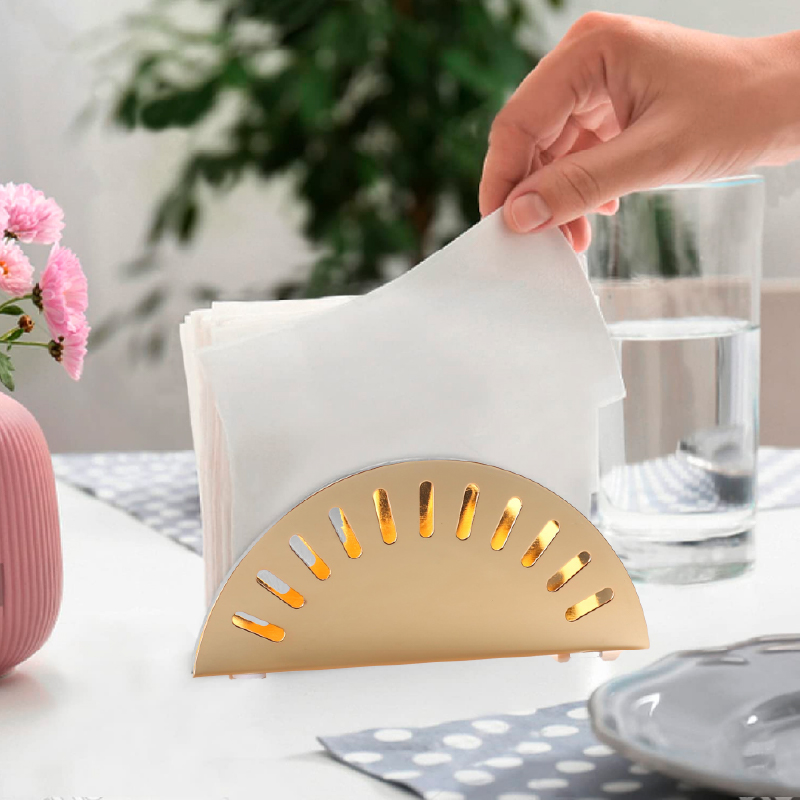 The Millerhaus Half Moon Napkin Holder in a striking gold color brings a touch of luxury and style to your dining area. Crafted from high-quality stainless steel, this holder is both functional and decorative, offering an elegant solution for keeping napkins neatly organized and easily accessible.