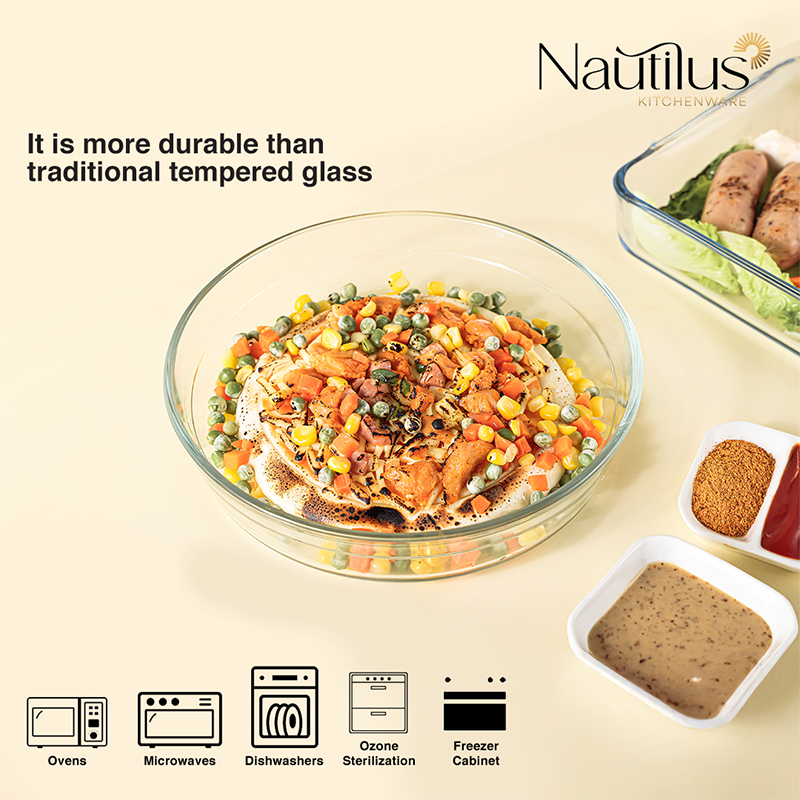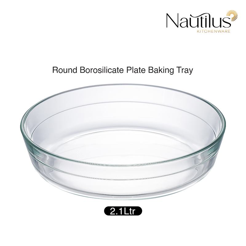 The Nautilus Round Baking Tray is a versatile and durable kitchen essential made from borosilicate glass. It is compatible with ovens, microwaves, and freezers, and its non-porous surface ensures that food odors and stains won’t linger. Featuring ergonomic handles for easy handling and dishwasher-safe convenience, this baking tray combines functionality with ease of use, making it a perfect addition to any kitchen.