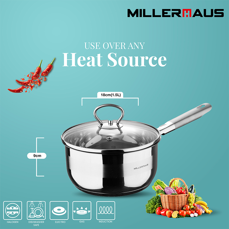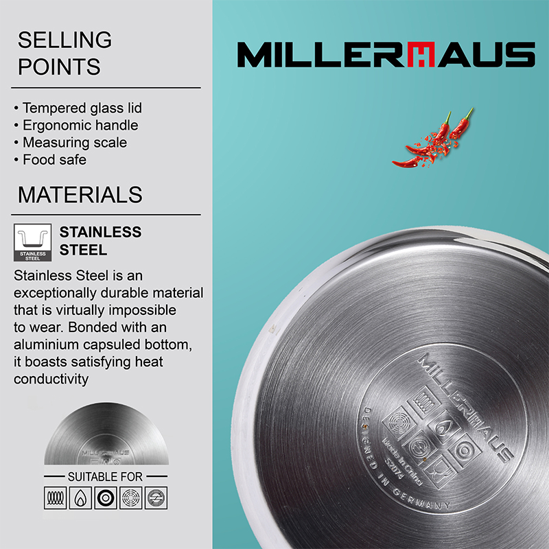 The Millerhaus INLINE Saucepan Ø18X9Cm is made from high-quality 18/10 stainless steel, offering superior corrosion resistance due to its 18% chromium and 10% nickel content. This composition ensures the material is non-reactive with acidic or alkaline foods, preserving flavors without imparting any metallic taste. The saucepan is induction compatible, dishwasher safe, and boasts exceptional durability, making it ideal for long-term use in moist kitchen environments. Its non-reactive surface and easy maintenance make it a versatile addition to any kitchen, preferred for its resistance to staining and discoloration.