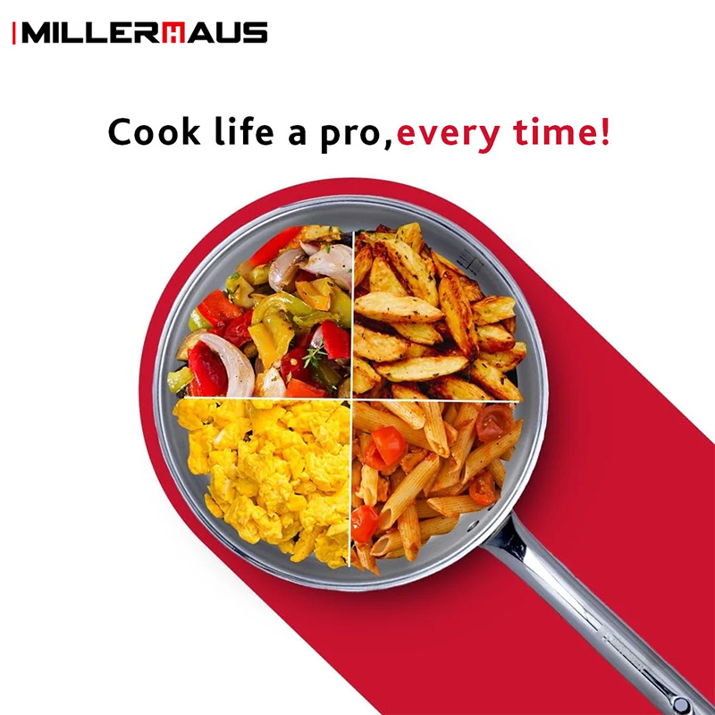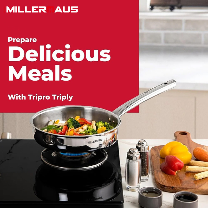 The Millerhaus Tri-Ply Sauté Pan with Lid (24 cm) is the ultimate kitchen tool for sautéing, searing, and simmering with precision. Made from food-grade tri-ply stainless steel, it delivers professional-grade performance with a sleek, silver finish. Its ergonomic design ensures effortless handling and versatile use.