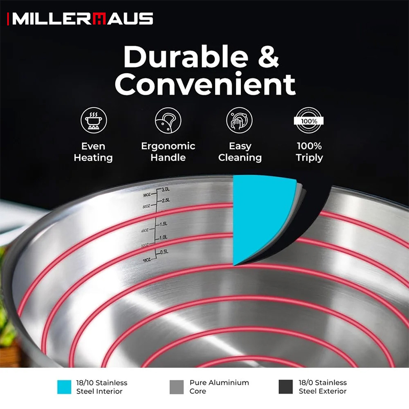 The Millerhaus Tri-Ply Sauté Pan with Lid (26 cm) is the ultimate kitchen tool for sautéing, searing, and simmering with precision. Made from food-grade tri-ply stainless steel, it delivers professional-grade performance with a sleek, silver finish. Its ergonomic design ensures effortless handling and versatile use.