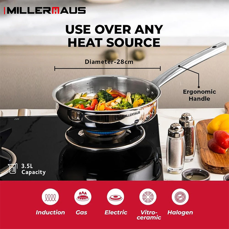 The Millerhaus Tri-Ply Sauté Pan with Lid (28 cm) is a premium cookware piece designed for versatile cooking. Crafted with tri-ply stainless steel, it features a robust exterior for durability and an aluminum core for exceptional heat conductivity. Perfect for sautéing, searing, and simmering, this sauté pan ensures even heat distribution for precise cooking. Its polished silver finish and ergonomic design make it a must-have for every kitchen.